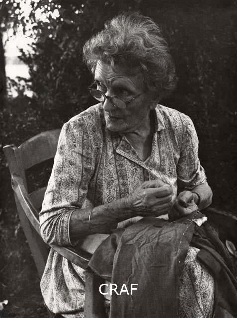 Ritratto della signorina Margherita Stanzani, con il volto occhialuto rivolto verso sinistra, ripresa mentre cuce, seduta nel parco della sua villaa S. Anna di S. Cesario sul Panaro (MO).