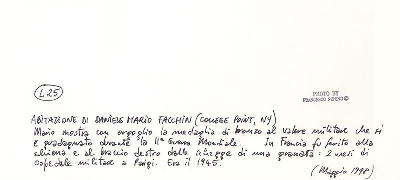 Daniele Mario Facchin, seduto alla scrivania del suo studio, mostra la medaglia di bronzo al valore militare guadagnata durante la Seconda Guerra mondiale.