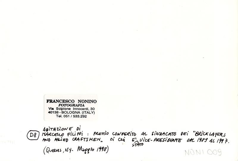 Ritratto di Marcello Filippi nella sua abitazione seduto sul divano, in primo piano il riconoscimento ricevuto dal sindacato dei muratori.