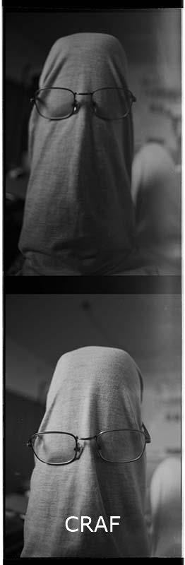 Autoritratto giocoso di Aldo Beltrame in un interno. Gli occhiali da vista del fotografo sono sistemati su un supporto coperto da un tessuto di cotone, a simulare forse una testa.