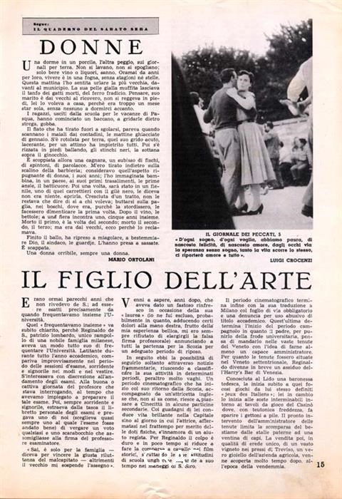 "IL GIORNALE DEI PECCATI, 5 « D'ogni sogno, d'ogni voglia, abbiamo paura, di nascosto felicità, di nascosto amore, dagli occhi via la speranza senza sogno, tanto la vita scorre lo stesso, ci riporterà amore e tutto ». " Didascalia riportata sotto all'immagine pubblicata nel fotoracconto dal titolo "Il giornale dei peccati" in Venerdì Il Caffè mensile di attualità n. 9 dicembre 1954.
