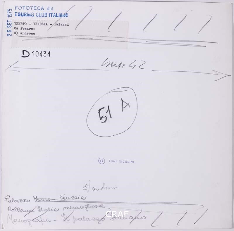 Scorcio dell'androne di Ca' Pesaro com le sue colonne cerchiate. Scatto realizzato in occasione della campagna fotografica per il volume Il palazzo italiano TCI del 1975, ma non pubblicato.