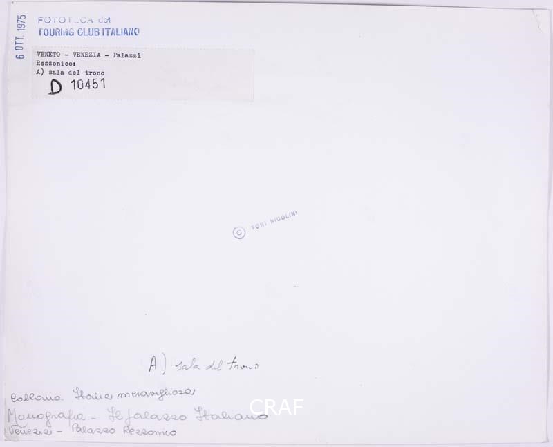 La sala del trono di Ca' Rezzonico, con il trono dorato e riccamente decorato da cui prende il nome. Scatto realizzato nell’ambito della campagna fotografica per il volume Il palazzo italiano TCI del 1975, ma non pubblicato.