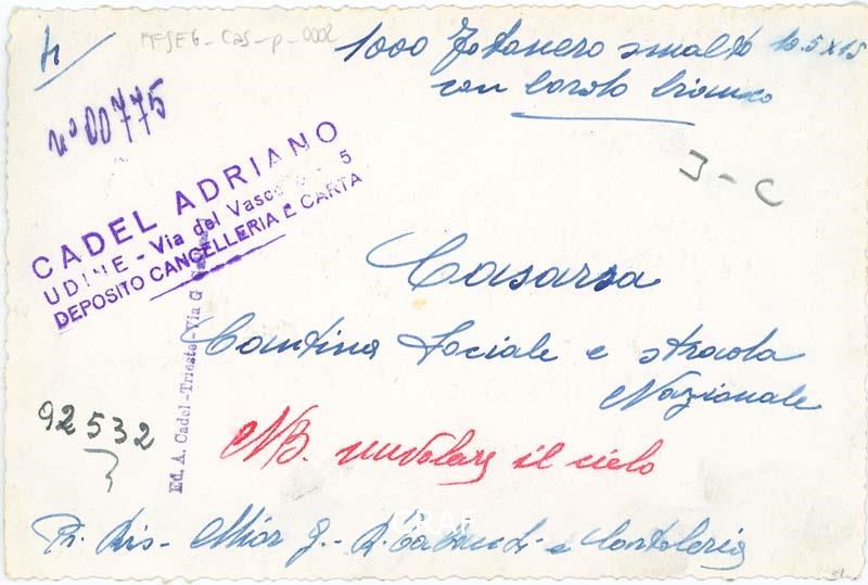 Veduta della Cantina Sociale Cooperativa ripresa da viale Udine (ex via Nazionale). Al lato destro della strada posano La signora Virginia con il piccolo Aldo Segale.