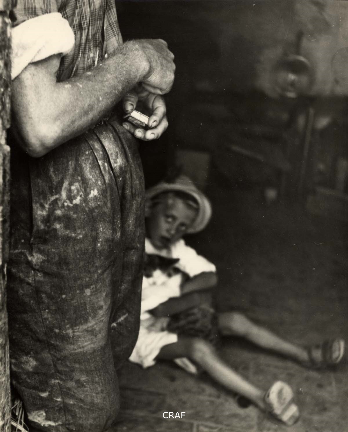 Alla destra della fotografia un uomo appoggiato ad un muro (si vede solamente il busto della persona) mentre tiene nella mano sinistra una scatola di fiammiferi; sullo sfondo, al centro della fotografia, un fanciullo con cappello in testa seduto a terra