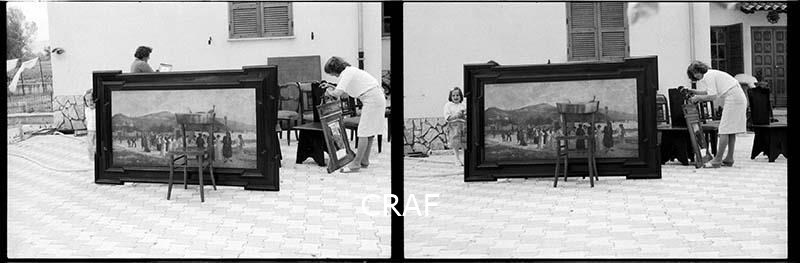 Una bambina spunta timidamente da dietro un grande quadro, sistemato temporaneamente all'esterno di un'edificio. Alle sue spalle due donne armeggiano con altri oggetti d'arredo. La fotografia è verosimilmente scattata nei dintorni di San Pelino, frazione di Avezzano (AQ) situata ai margini della Piana del Fucino.