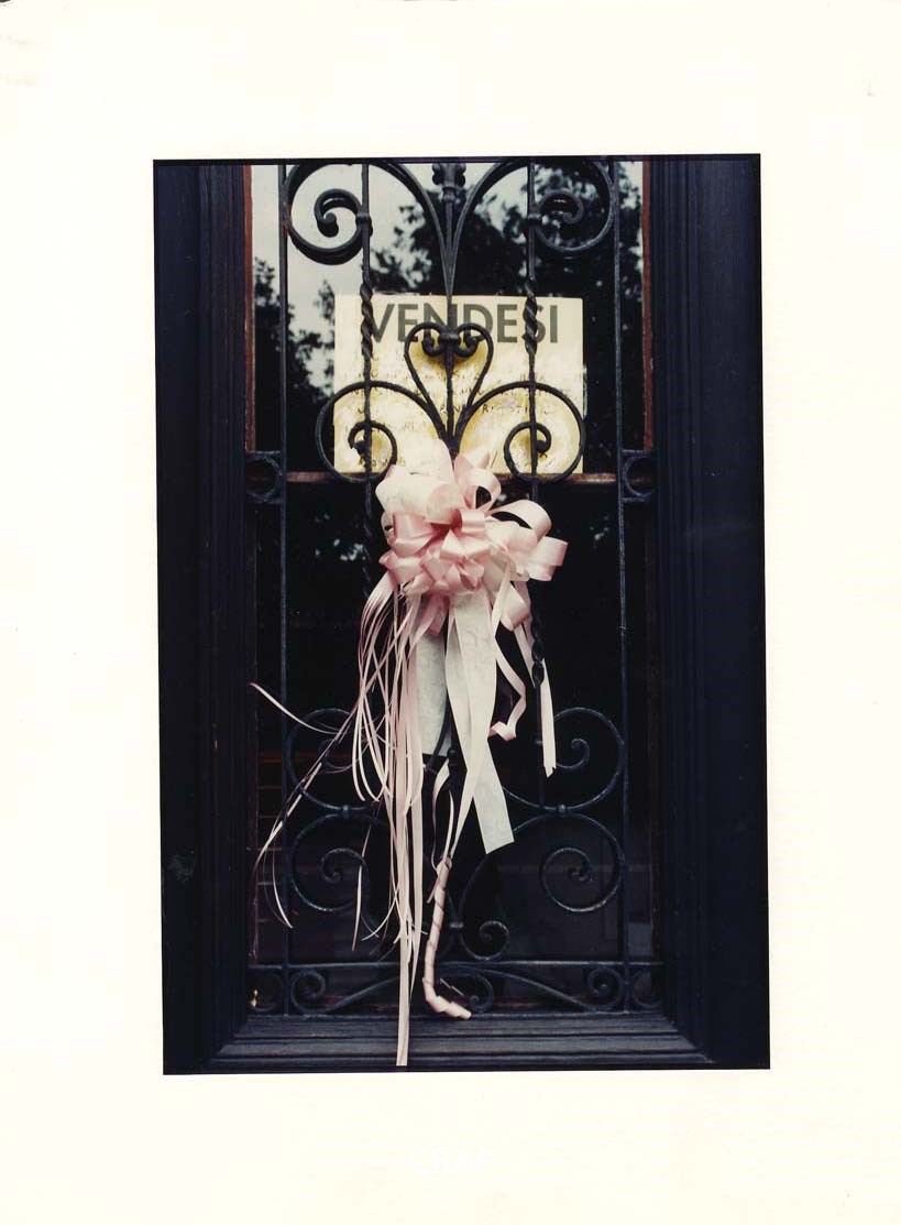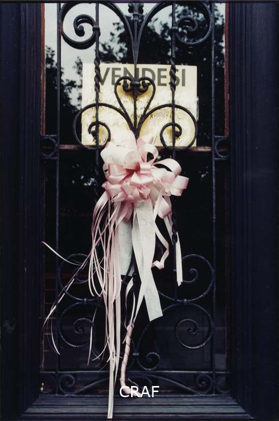 Fiocco celebrativo della nascita di una bambina su di un portone con la scritta "Vendesi"