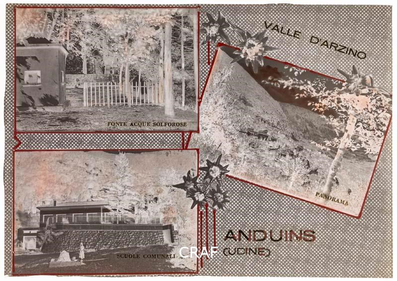 Fotocomposizione con tre immagini di Anduins: le scuole comunali, le fonti solforose e un panorama sono disposte in senso orario fra disegni di stelle alpine e le didascalie.