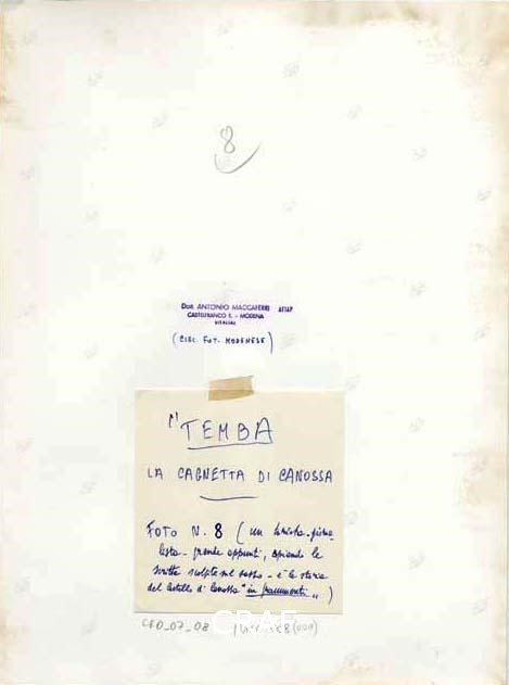 Un uomo in piedi di profilo ripreso mentre, con la sigaretta in bocca, trascrive l'iscrizione (ANNO 1255/DISTRUZIONE DEL CAS/TELLO AD OPERA DEI/REGG IANI) che reca una lapide con monaco con mannaia in rilievo. Sullo sfondo vegetazione.