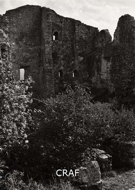 Quinta diroccata del castello di Canossa con feritoie, ripresa dall'interno del maniero, ormai invaso dalla vegetazione.