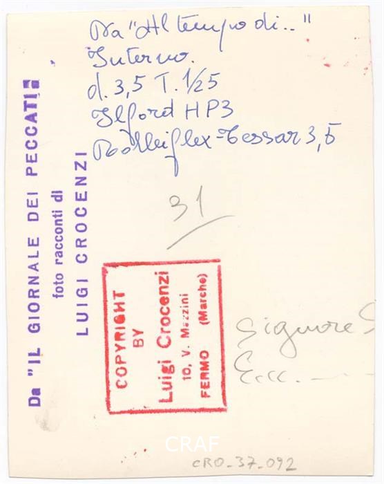 Frate cappuccino in preghiera. Immagine appartenente agli scatti del romanzo fotografico dal titolo "Al tempo di..." a cui Crocenzi lavorò a partire dal 1954 ma che non fu mai pubblicato. Alcune delle immagini che Crocenzi scattò per questo romanzo fotografico furono pubblicate in più puntate su Venerdì Il Caffè mensile di attualità negli anni compresi tra il 1954 e il 1955 (n.9 del 1954; nn.2-3-4 del 1955) con il titolo "Il giornale dei peccati".