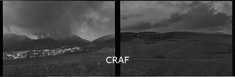 Veduta di un paese non identificato alle pendici delle montagne in Abruzzo. La scena è illuminata da una luce drammatica, il cielo è coperto da nuvole minacciose.