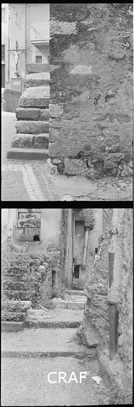 Scorcio di un paese non identificato in Abruzzo. In primo piano si vede il dettaglio d'angolo del muro di pietra di un'edificio, sullo sfondo un crocifisso.