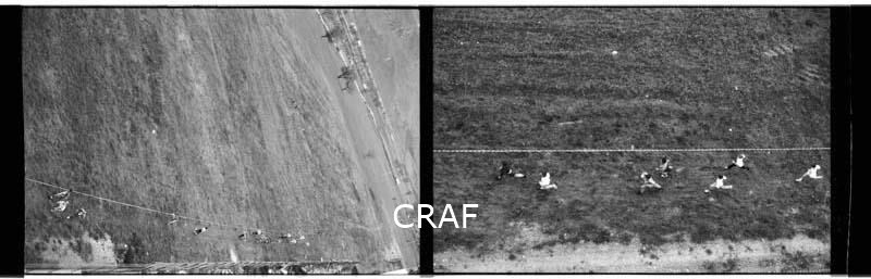 Veduta ripresa dall'alto di una gara podistica nella periferia nord di Avezzano (AQ). Un gruppo di corridori sta attraversando un prato lungo la linea delimitata da un nastro segnaletico a righe. La fotografia è verosimilmente scattata da uno dei piani alti del condominio "Le Rondini", abitazione del fotografo.