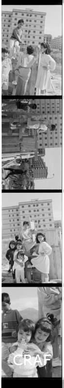 Ritratto in esterno di un gruppo di bambini che gioca attorno a una piccola struttura lignea probabilmente nei pressi di un cantiere. Sullo sfondo si riconosce il condominio "Le Rondini", abitazione del fotografo, nella periferia nord di Avezzano (AQ). Il negativo fa parte di una sequenza di 4 scatti.