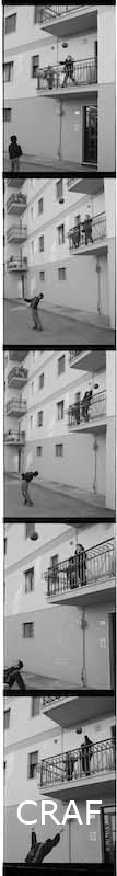 Giochi di bambini presso il condominio "Le Rondini" nella zona nord di Avezzano (AQ). Un bambino in cortile e una bambina sul balcone si lanciano un pallone. Un altro bambino più piccolo li osserva da dietro il parapetto. Il negativo fa parte di una sequenza di 5 scatti.