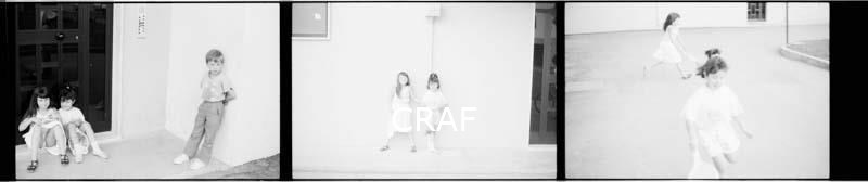 Due bambine in abiti estivi giocano con delle racchette da tennis nel cortile del condominio "Le Rondini" nella zona nord di Avezzano (AQ).
