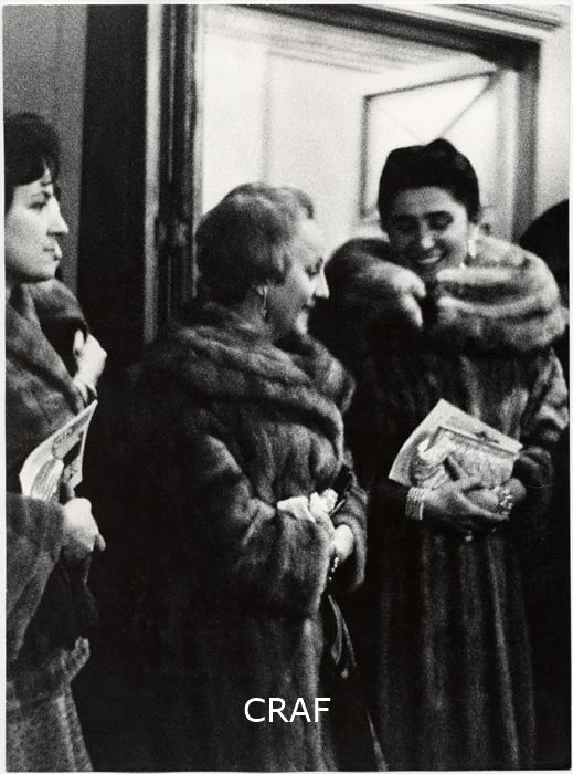Ritratto di tre quarti in piedi di quattro signore sorridenti (una s'intrvvede), che indossano pellicce, gioielli, borsetta.