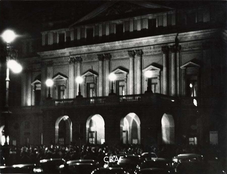 Milano. Veduta notturna esterna del Teatro alla Scala. Folla e automobiliantistanti.