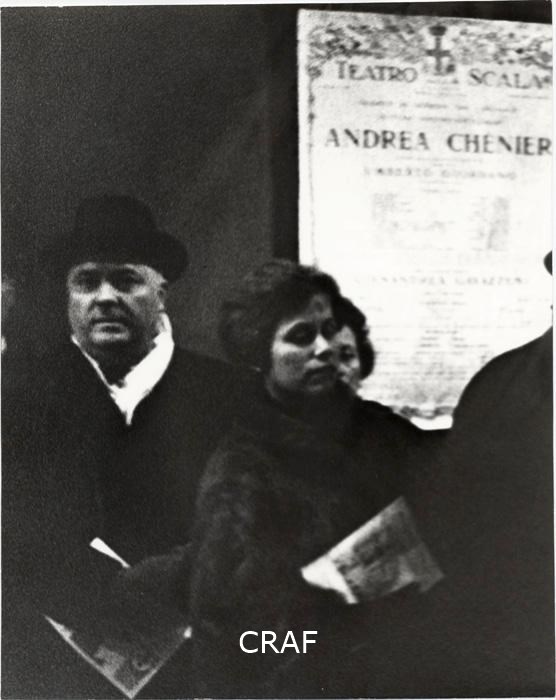 Ritratto a tre quarti di un uomo e di una donna. Sullo sfondo le figure parziali di altre due persone e affissa al muro una locandina teatrale de" La Scala" di Milano: Andrea Chenier.