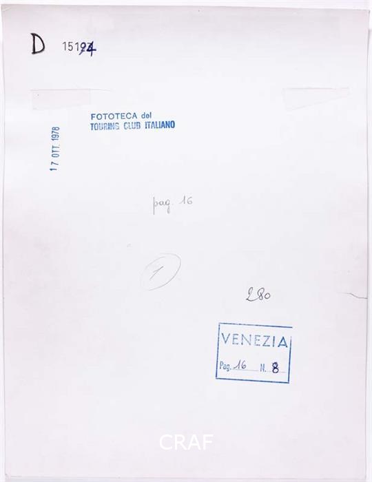 I cavalli di S. Marco ingabbiati tra le impalcature erette per restauri alla basilica di S. Marco. Didascalia riportata sotto all'immagine pubblicata nel volume Venezia TCI del 1978 (immagine n. 8, pag. 16).