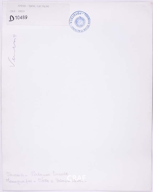 Veduta del bacino di San Marco con Palazzo Ducale ripresa dall'isola di San Giorgio Maggiore. Scatto realizzato durante la campagna fotografica per il volume Le corti italiane TCI del 1977 ma non pubblicato. Sul recto si nota l'iscrizione "Per ROSSELLA BIGI / PALAZZI REALI", curatrice del volume.