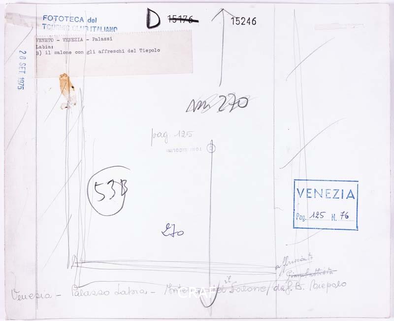 Il salone di Palazzo Labia con gli affreschi di Gian Battista Tiepolo. Didascalia riportata sotto all'immagine pubblicata nel volume Venezia TCI del 1978 (immagine n. 76, pag. 125). Scatto realizzato durante la campagna fotografica per il volume Il palazzo italiano TCI del 1975, ma in quell'occasione non pubblicato.