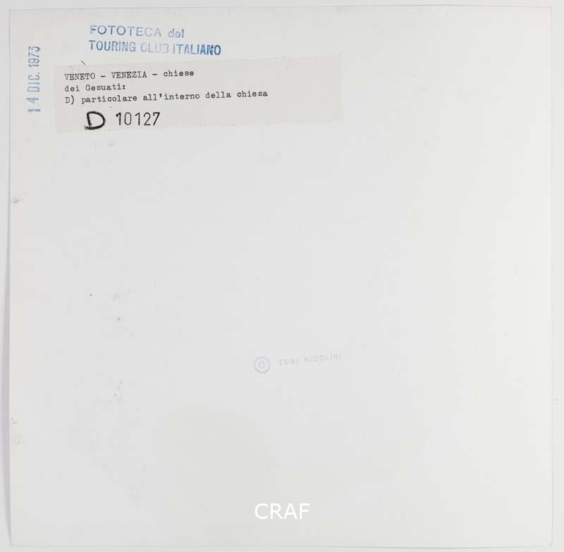 Particolare dell'interno della chiesa di Santa Maria Assunta, detta dei Gesuiti, nel sestiere di Cannaregio. L'etichetta sul verso riporta erroneamente la dicitura "dei Gesuati", chiesa che si trova invece a Dorsoduro.