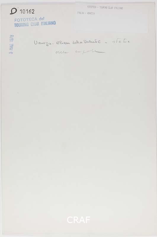 Particolare delle statue sotto alla cupola della chiesa della Salute. Sullo sfondo si intravede il bacino di San Marco. Scatto realizzato nell'ambito della campagna fotografica per il volume Venezia TCI del 1978, ma in quell’occasione non pubblicato.