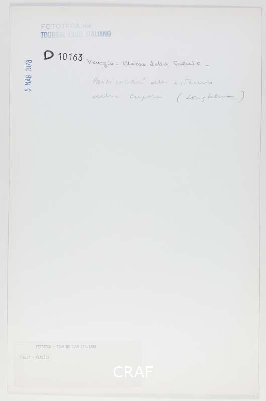 Particolare delle statue della cupola della chiesa della Salute. Sullo sfondo si intravede il bacino di San Marco. Scatto realizzato nell'ambito della campagna fotografica per il volume Venezia TCI del 1978, ma in quell’occasione non pubblicato.
