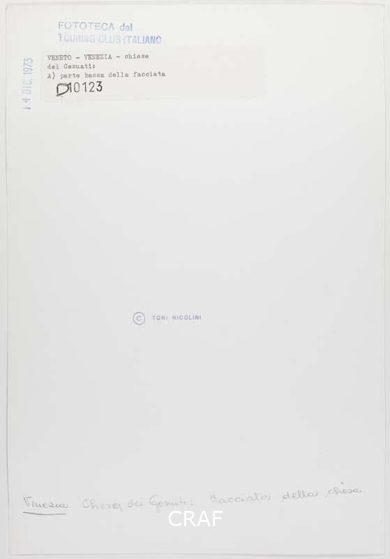 Parte inferiore della facciata della chiesa di Santa Maria Assunta, detta dei Gesuiti, nel sestiere di Cannaregio. L'etichetta sul verso riporta erroneamente la dicitura "dei Gesuati", chiesa che si trova invece a Dorsoduro.