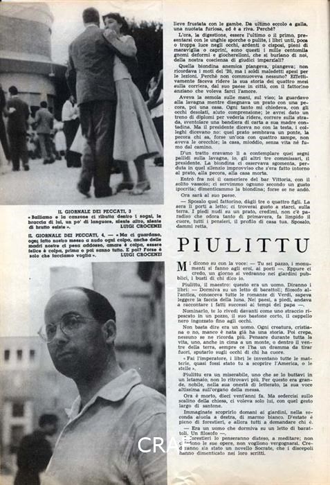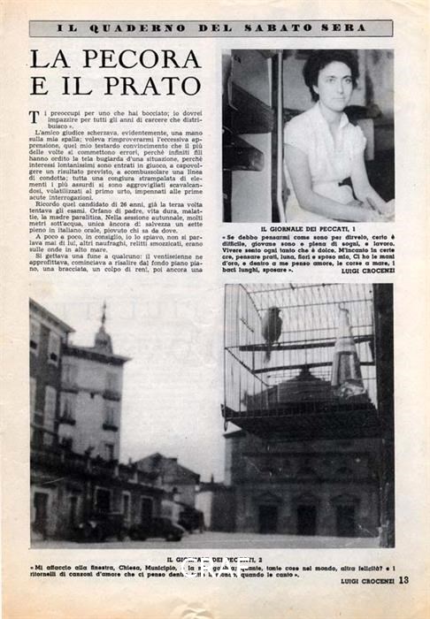 "IL GIORNALE DEI PECCATI, 2 « Mi affaccio alla finestra, Chiesa, Municipio, e la mia gabbia; quante, tante cose nel mondo, altra felicità? e i ritornelli di canzoni d'amore che ci penso dentro tutto il mondo, quando le canto »." Didascalia riportata sotto all'immagine pubblicata nel fotoracconto dal titolo "Il giornale dei peccati" in Venerdì Il Caffè mensile di attualità n. 9 dicembre 1954.