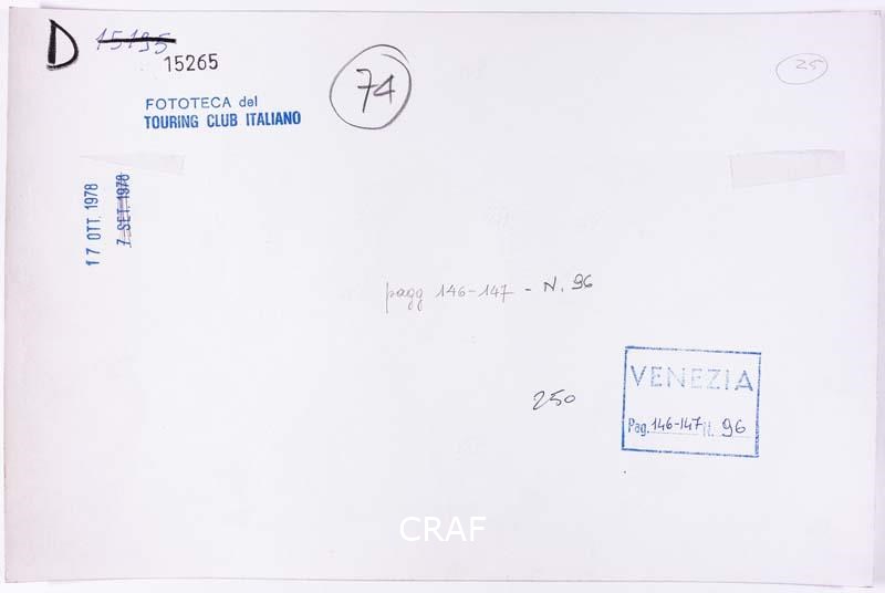 La vetrina della bottega di un intagliatore di cornici. Didascalia riportata sotto all'immagine pubblicata nel volume Venezia TCI del 1978 (immagine n. 96, pagg. 146-147).