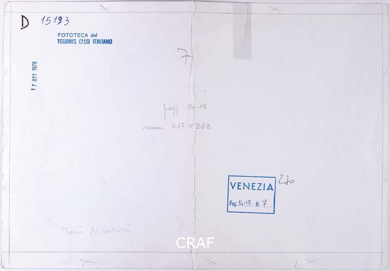 L'alta marea che spesso invade in autunno e d'inverno piazza S. Marco. Didascalia riportata sotto all'immagine pubblicata nel volume Venezia TCI del 1978 (immagine n. 7, pagg. 14-15).