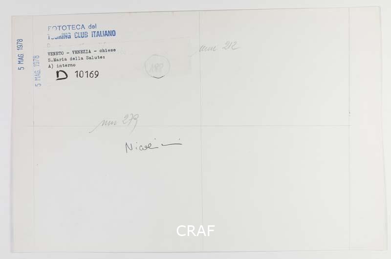 L'interno della chiesa di S. Maria della Salute del Longhena. Didascalia riportata sotto all'immagine pubblicata nel volume Venezia TCI del 1978 (immagine n. 68, pagg. 114-115).