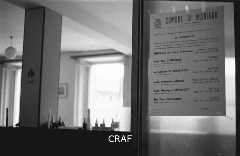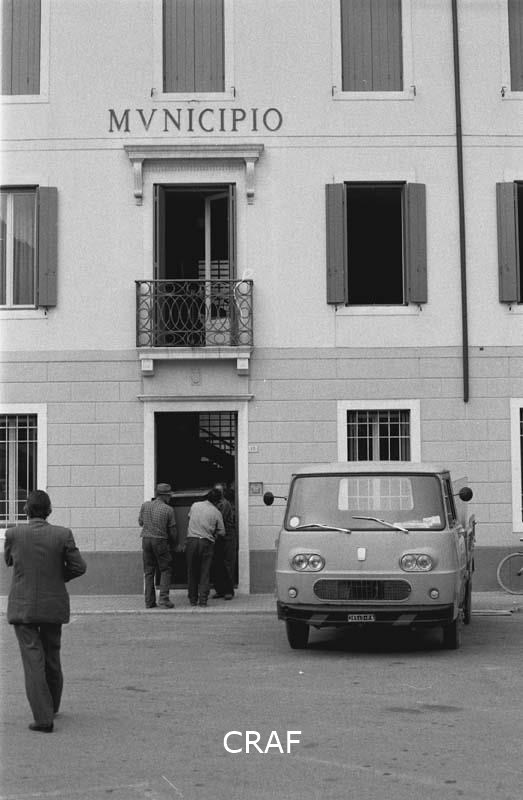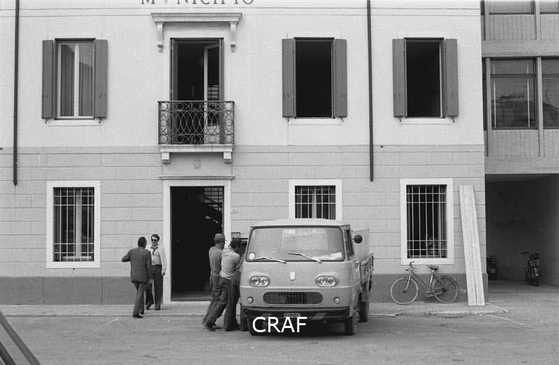 Uomini davanti al Palazzo del Municipio di Maniago. Due sono intenti a caricare...