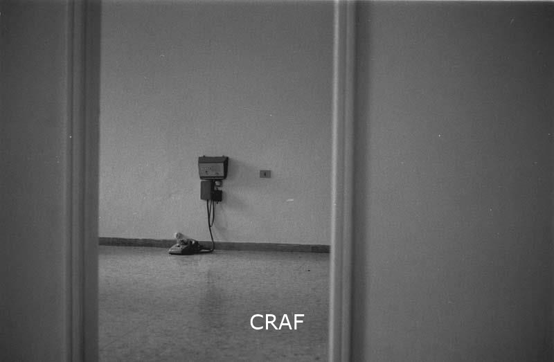 Telefono fisso appoggiato a terra all'interno di un edificio e collegato...