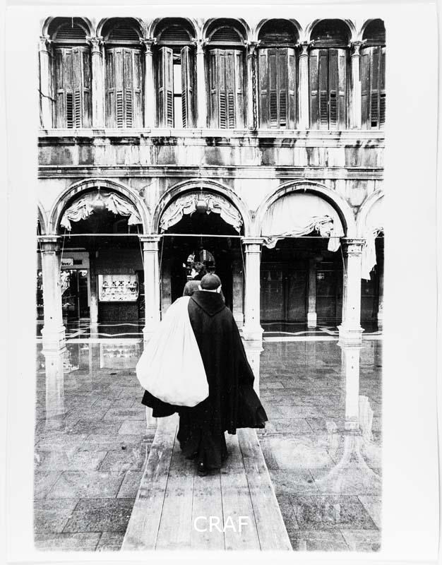 Un frate percorre una passerella in direzione delle Procuratie Vecchie, in una...
