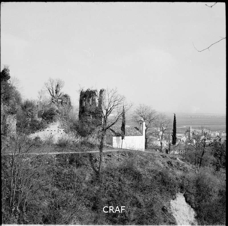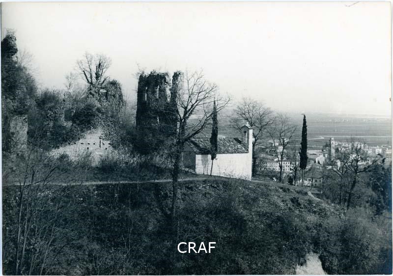 Veduta dei ruderi del Castello sulle pendici del monte Jôf con Maniago sullo...