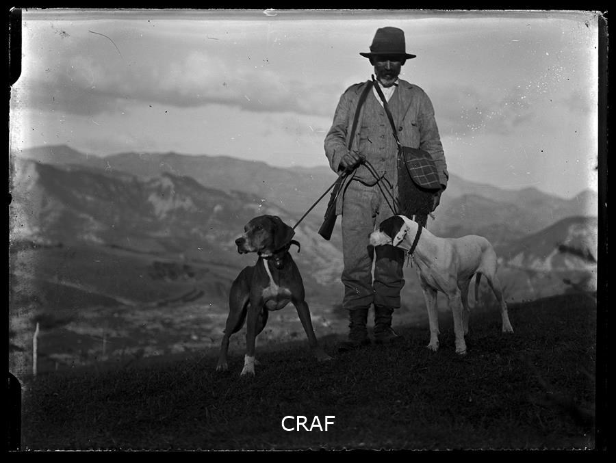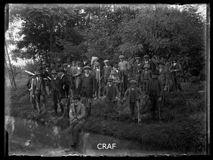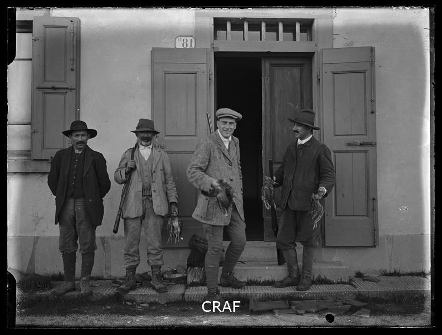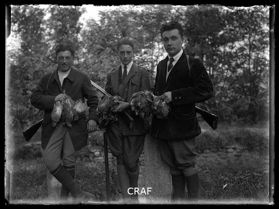 Gruppo di cacciatori dopo una battuta di caccia, con delle pernici in mano