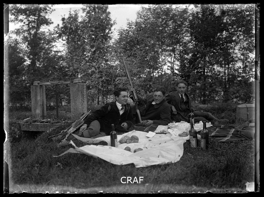 Gruppo di cacciatori durante un momento conviviale, una pic-nic sull'erba