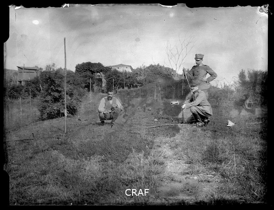 Tre cacciatori (probabilmente due guardie forestali) mentre preparano delle...