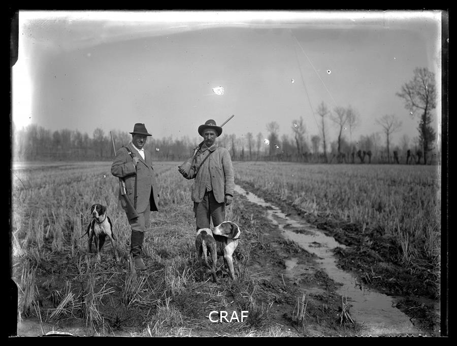 Due cacciatori assieme ai cani durante una battuta di caccia