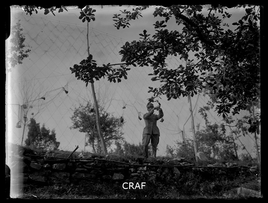 Un cacciatore (probabilmente un guardiacaccia) mentre sistema delle reti da...