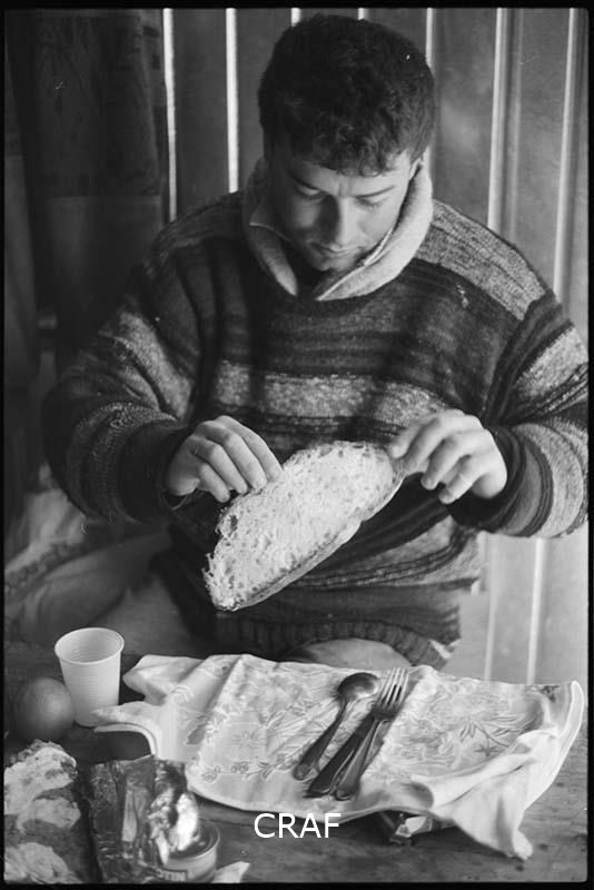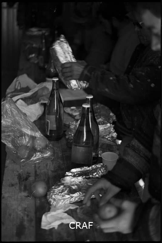 Pausa pranzo in un cantiere edile, all'interno di un container metallico. Gli...