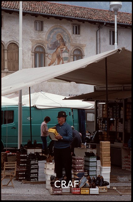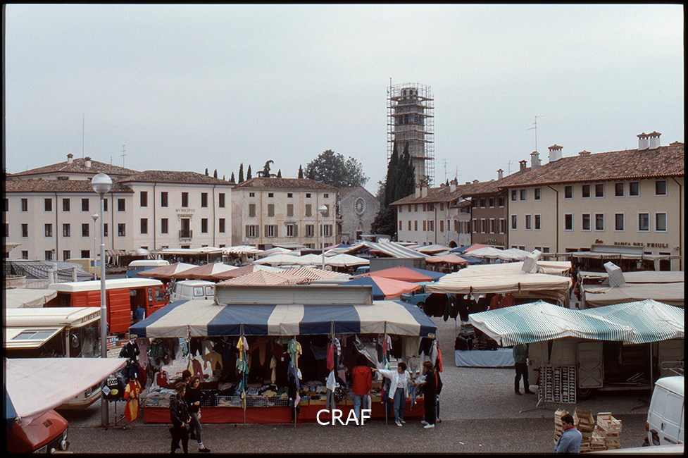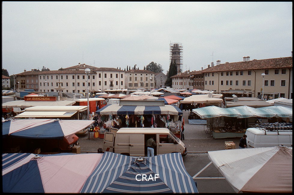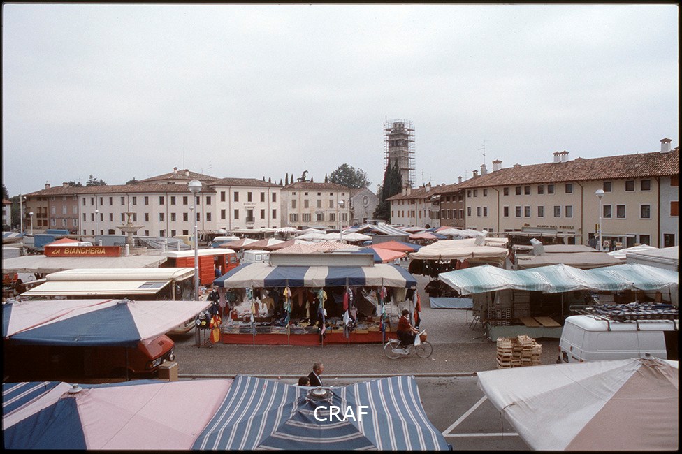 Veduta delle bancarelle del mercato; sullo sfondo la facciata di Palazzo...