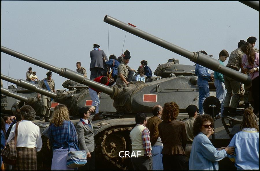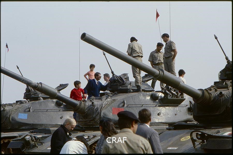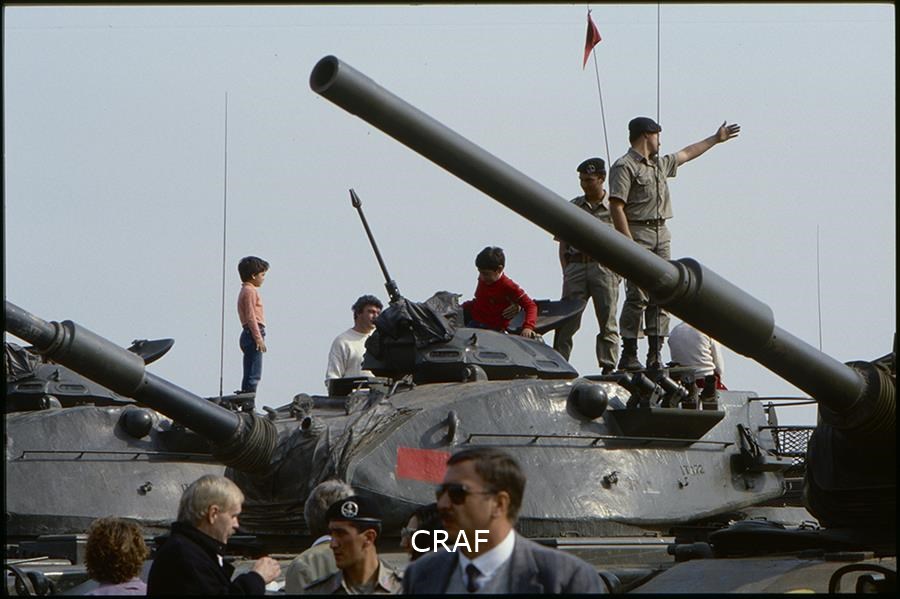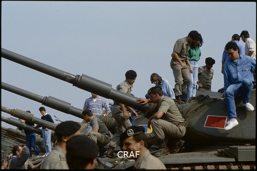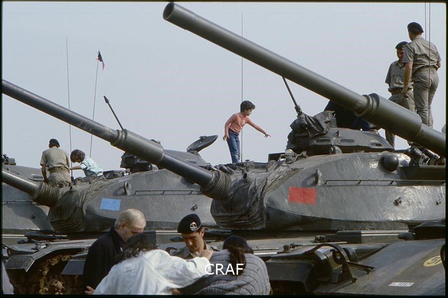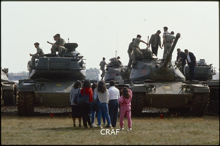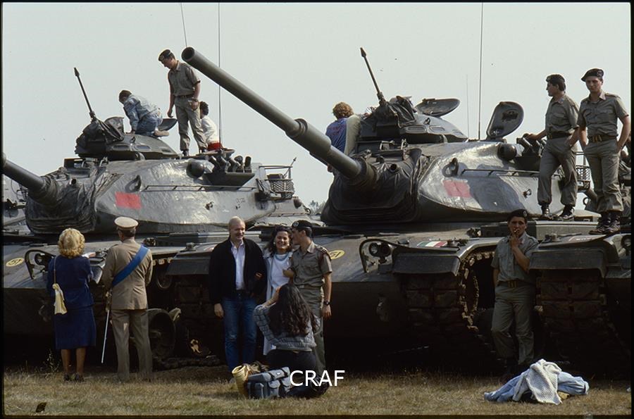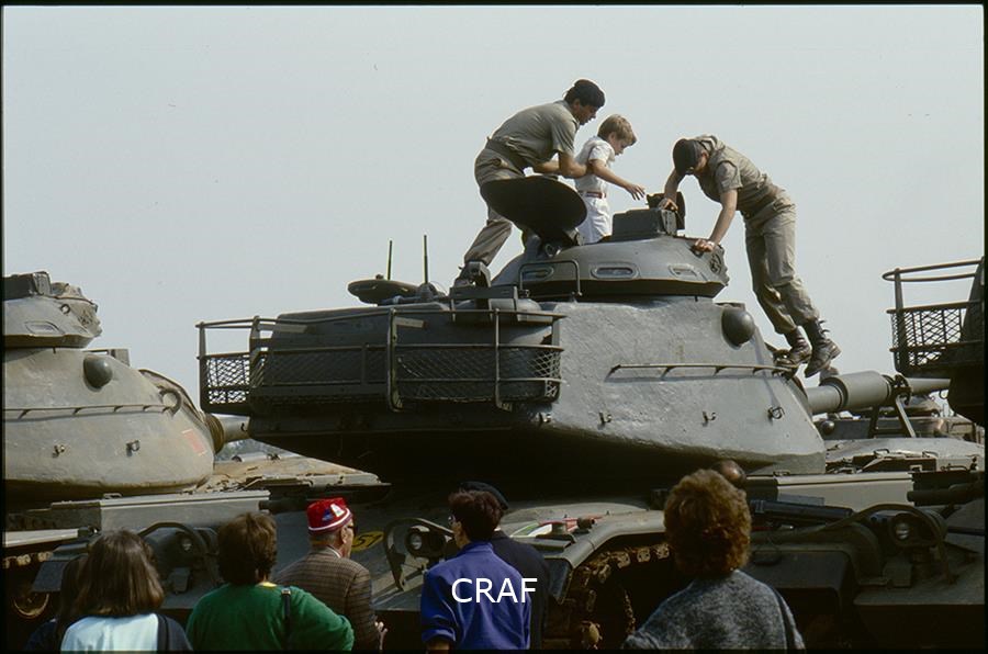 Soldati e civili guardano i carri armati da vicino
