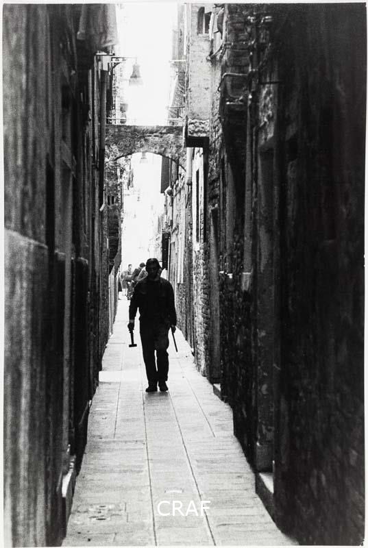 Un uomo cammina lungo una stretta calle di Castello. Scatto realizzato in...