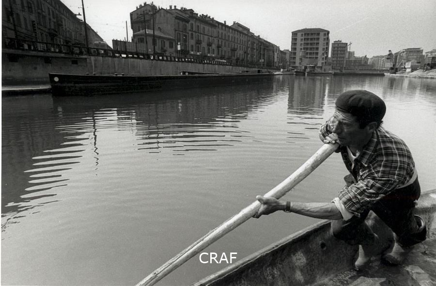 Un uomo spinge il barcone lungo il Naviglio