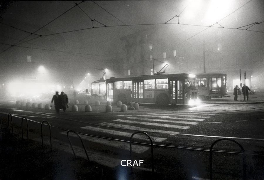 Veduta del piazzale della stazione immerso nella foschia